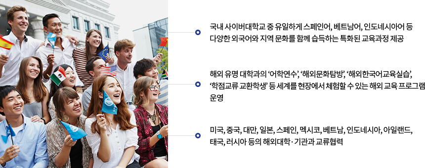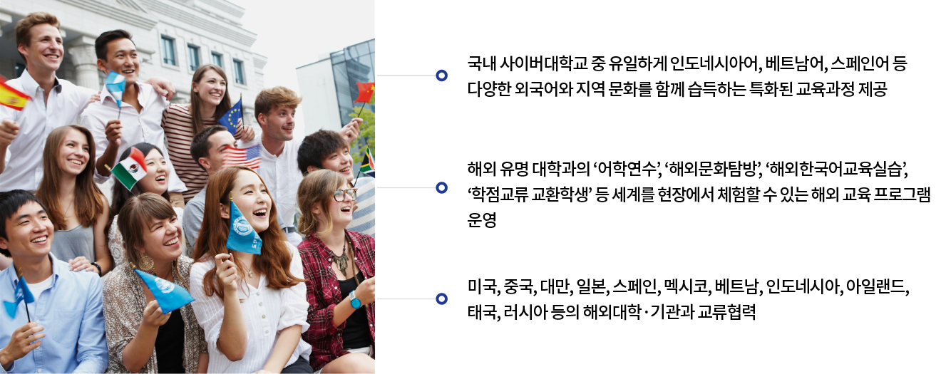 ±¹³» »çÀ̹ö´ëÇб³ Áß À¯ÀÏÇÏ°Ô ½ºÆäÀξî, º£Æ®³²¾î, Àεµ³×½Ã¾Æ¾î µî ´Ù¾çÇÑ ¿Ü±¹¾î¿Í Áö¿ª ¹®È¸¦ ÇÔ²² ½ÀµæÇÏ´Â Æ¯ÈµÈ ±³À°°úÁ¤ Á¦°ø
